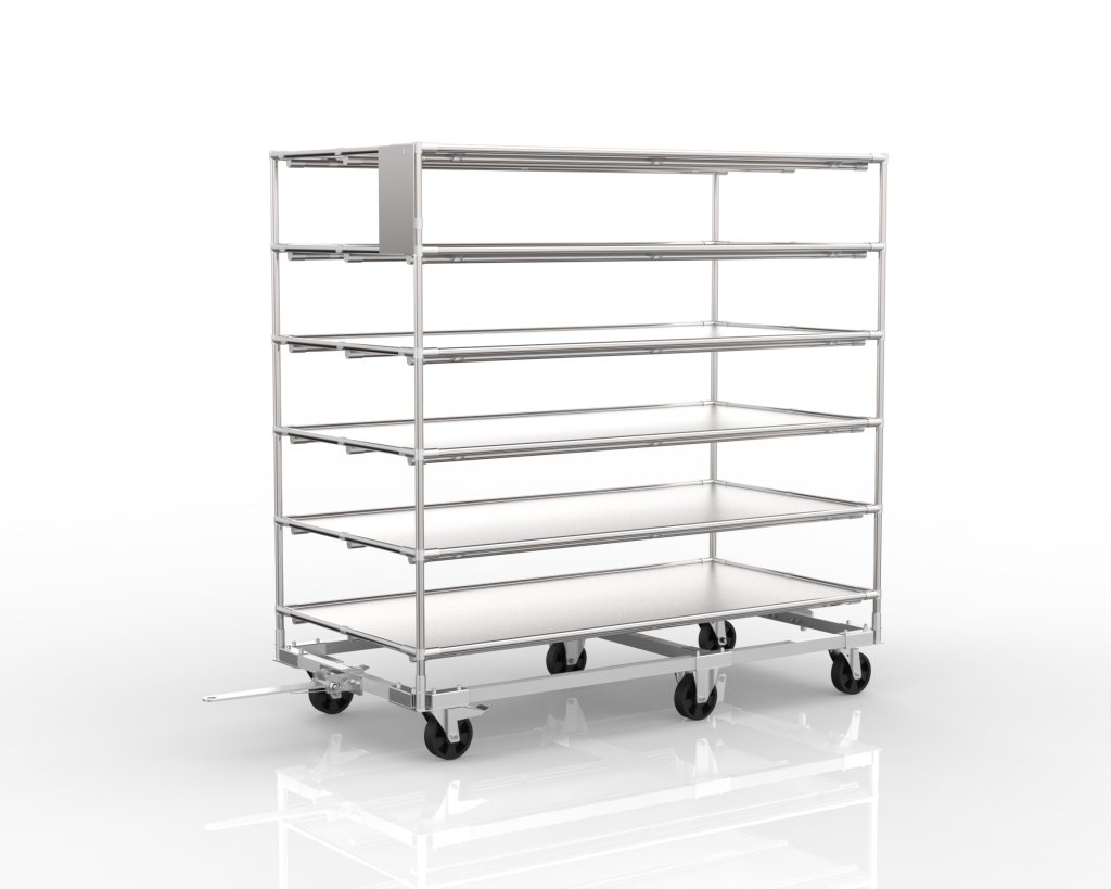 Wózek półkowy wykonany na podwoziu stalowym z nadbudową w systemie rurowym. Możliwość podłączenia większej liczby wózków w ciągu. pełny opis i parametry