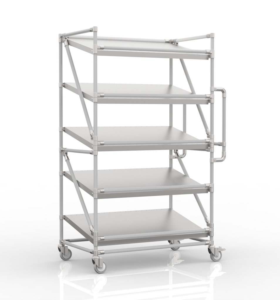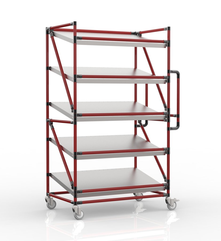 Wózek do skrzynek z pięcioma pochyłymi półkami jest praktycznym pomocnikiem przy transporcie w firmach produkcyjnych i centrach pełny opis i parametry