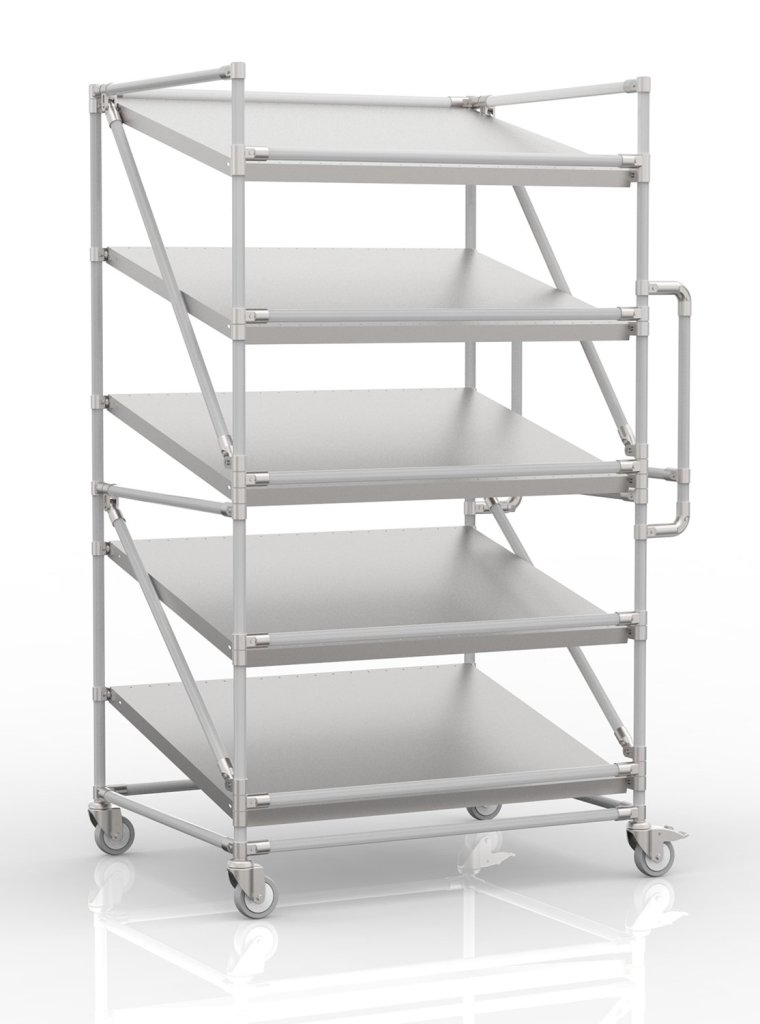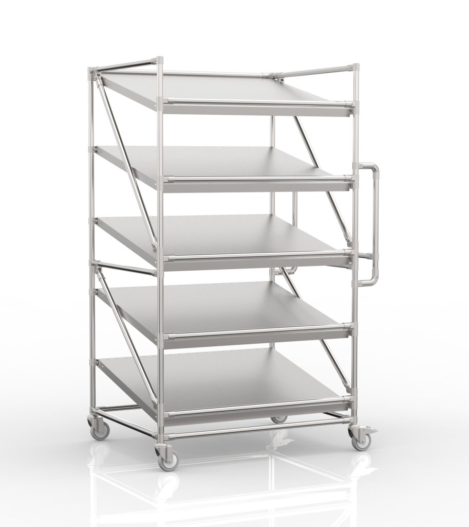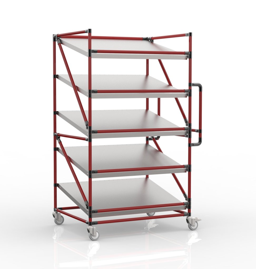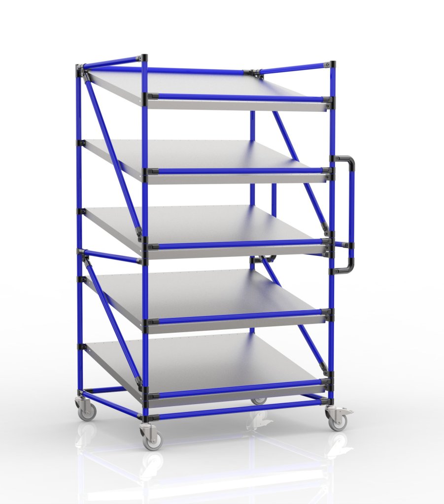 Wózek do skrzynek z pięcioma pochyłymi półkami jest praktycznym pomocnikiem przy transporcie w firmach produkcyjnych i centrach pełny opis i parametry