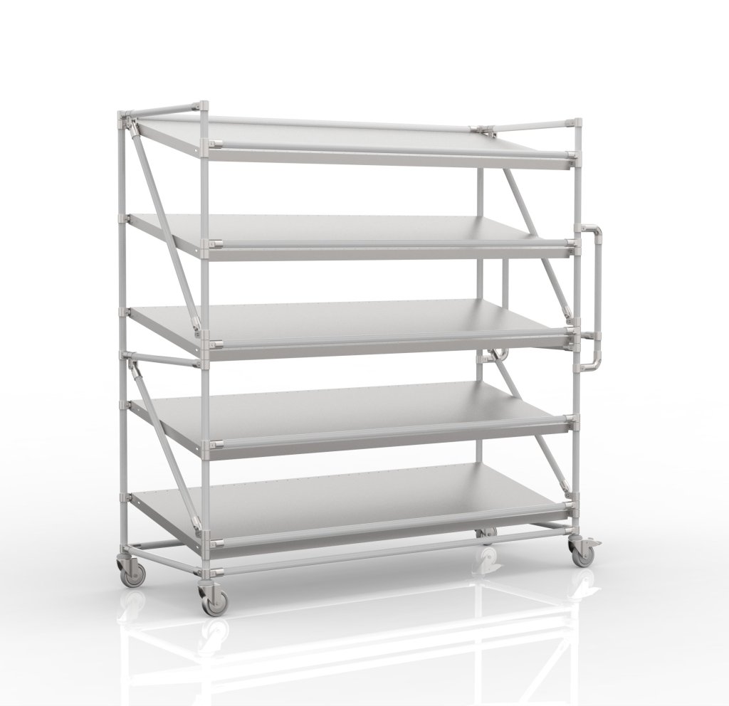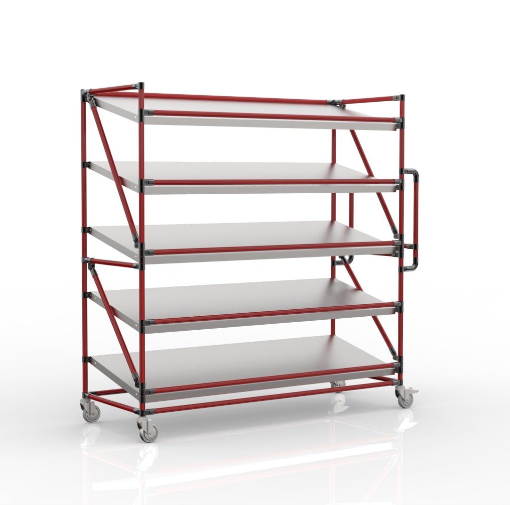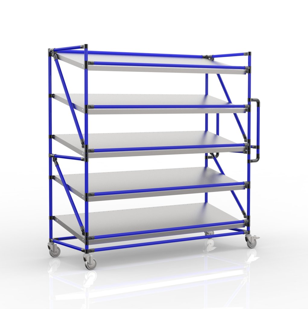 Wózek regałowy do skrzynek z pięcioma ukośnymi półkami to praktyczny pomocnik przy obsłudze w firmach produkcyjnych i centrach logistycznych, szczególnie w obszarze e-commerce.
