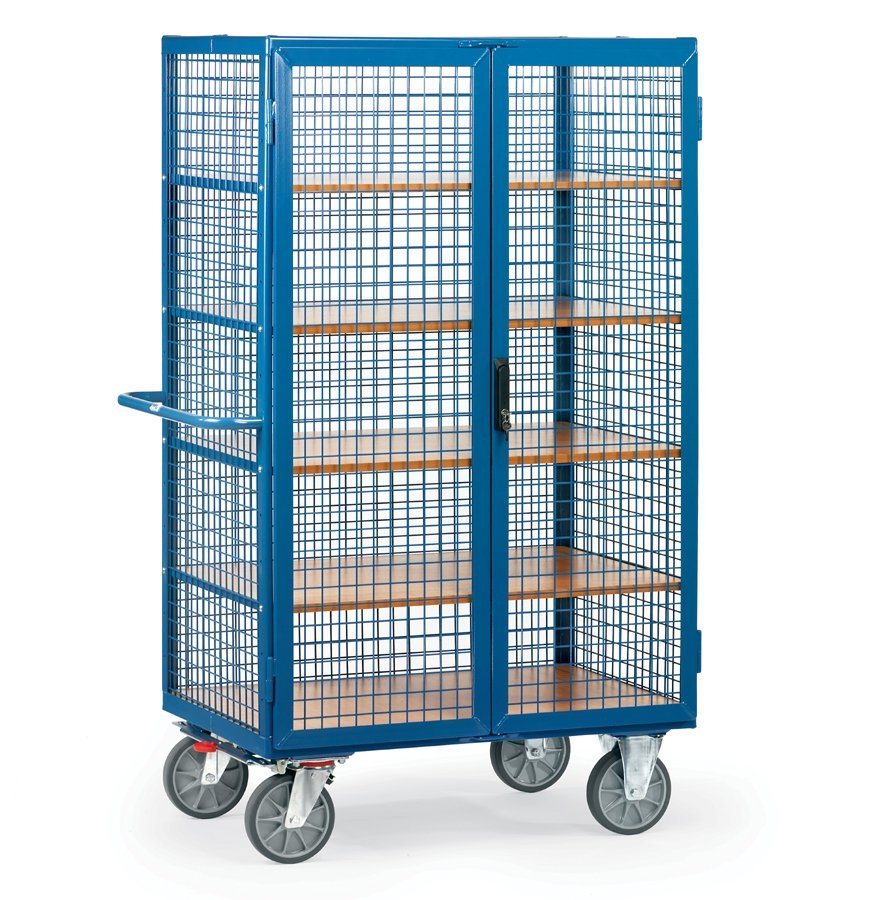 Niemiecki wózek szafkowy z uchwytem, ​​ścianki z siatki drucianej, spawana kątowa konstrukcja stalowa. Drzwi otwierane dwustronnie. Półki wykonane z twardego materiału drewnopochodnego. Nośność jednej półki wynosi 90 kg. 4 specjalne koła pneumatyczne Fetra TPE, z czego 2 obrotowe z hamulcem, 2 stałe.