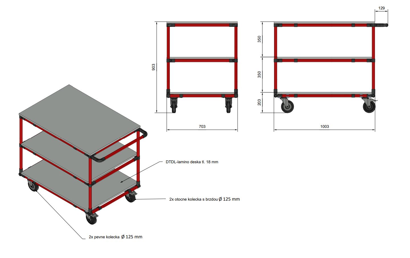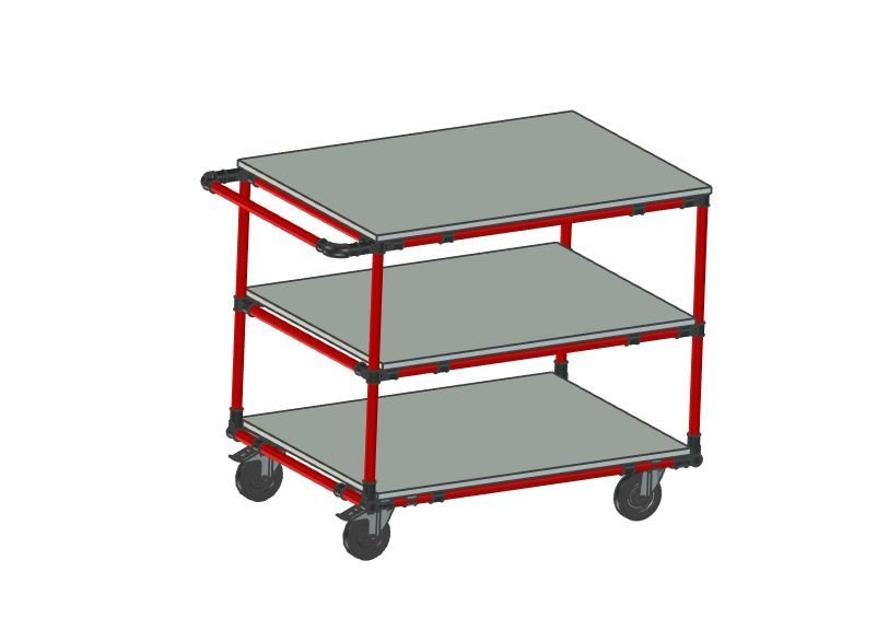 Wózek transportowy z systemu modułowego rurowego to poręczny pomocnik odpowiedni do obiektów przemysłowych, magazynów i hal produkcyjnych. Dzięki solidnej konstrukcji i dużej nośności jest idealnym rozwiązaniem do transportu szerokiej gamy towarów i materiałów. Płyta laminowana o grubości 18 mm zapewnia solidną i stabilną powierzchnię do przechowywania. Udźwig wózka 300 kg, udźwig podłogi 100 kg. Wózek wyposażony jest w koła o średnicy 120 mm, które umożliwiają łatwe i płynne przemieszczanie.