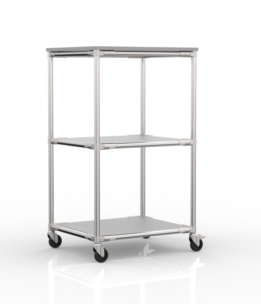 Wózek regałowy wykonany z rurowego systemu modułowego, odpowiedni do pomieszczeń przemysłowych, magazynów i hal produkcyjnych. Nadaje się do transportu towarów i materiałów. Płyta laminowana o grubości 18 mm, nośność wózka 150 kg, nośność podłogi 50 kg.