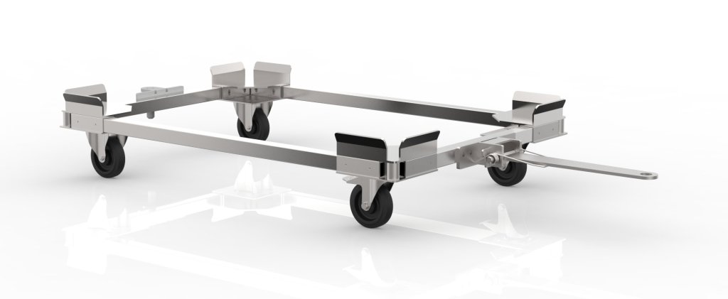 Podwozie do transportu palet EURO, z dyszlem umożliwiającym łączenie kilku sztuk jeden za drugim (tzw. system milk-run). Dzięki nośności do 750 kg idealnie nadaje się do transportu cięższych przedmiotów. 2 kółka skrętne z hamulcem i 2 skrętne bez hamulca, wszystkie o średnicy 125 mm. Wymiary podwozia 1240 x 840 x 238 mm. Możliwość wyboru wariantu ESD.