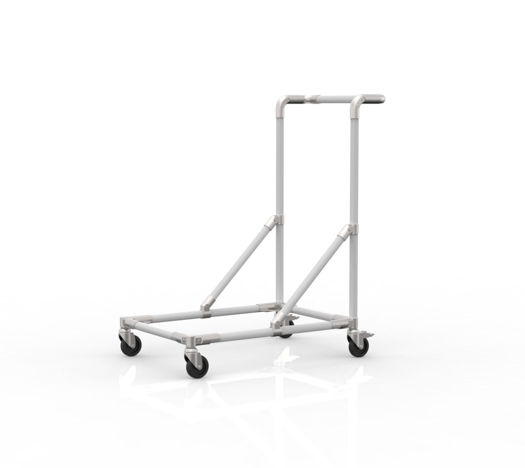 Podwozie manipulacyjne z uchwytem. Wykonane z systemu rurowego. 2 kółka skrętne z hamulcem i 2 skrętne bez hamulca, wszystkie o pełny opis i parametry