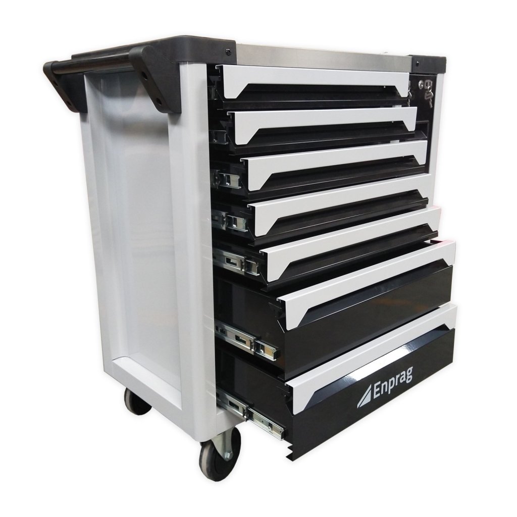 Warsztatowy wózek na narzędzia - 7x szuflada + zestaw 250 narzędzi w sześciu piankowych wkładkach. Wysokość 951 x szerokość 820 x głębokość 459 mm. 5x szuflada o wysokości 58 mm i 2x szuflada o wysokości 136 mm. 2 kółka obrotowe i 2 stałe, uchwyt. Kolor szary RAL 7040 / czarny RAL 9017.