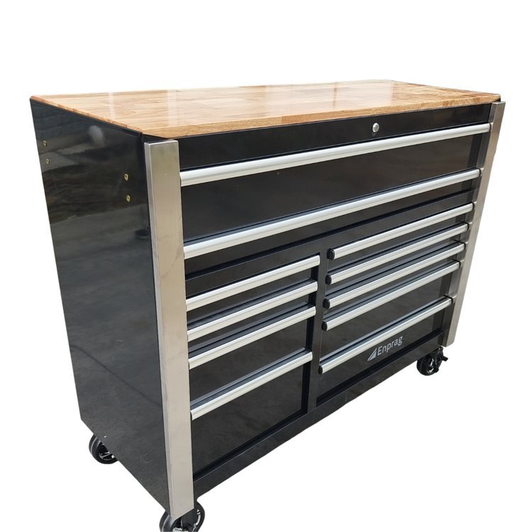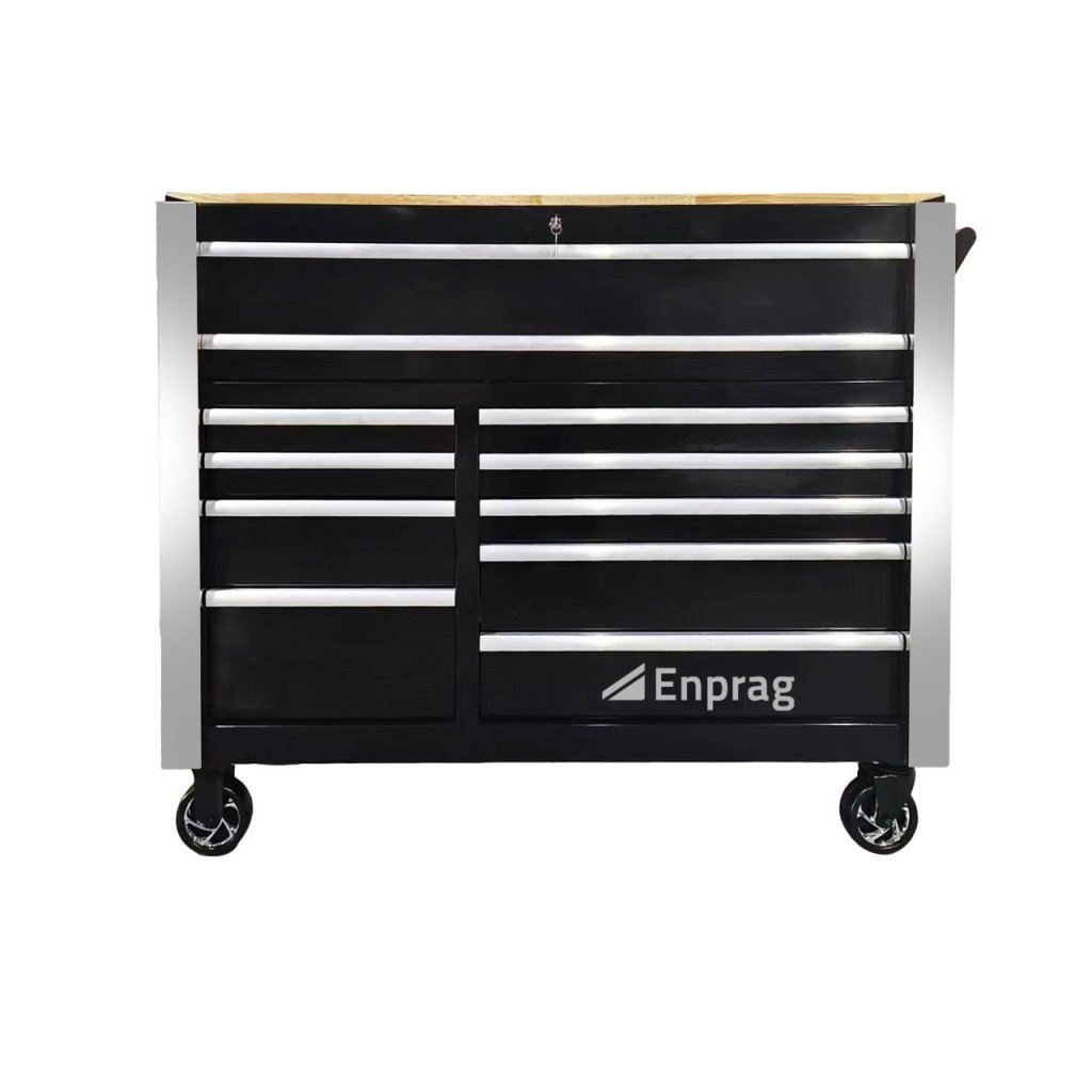 Wózek warsztatowy na narzędzia - 12x szuflada. Wysokość 945 x szerokość 972 x głębokość 466 mm. 2 koła skrętne i 2 stałe, uchwyt. Kolor czarny RAL 9017.