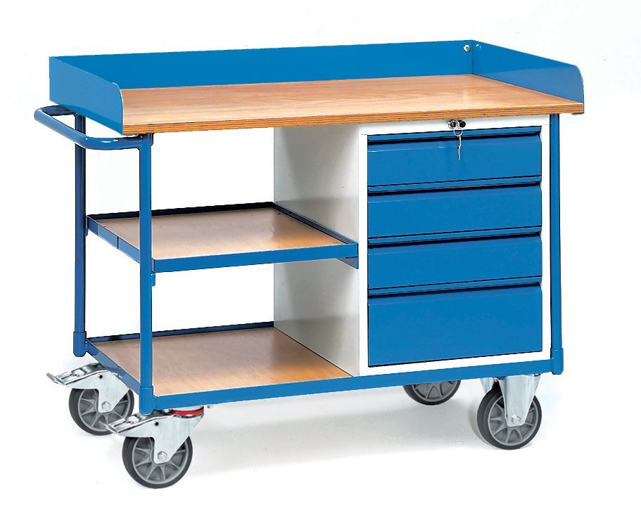 Wózek warsztatowy produkcji niemieckiej, konstrukcja stalowa, powierzchnia robocza ze sklejki gr. 22 mm, z trzech stron podwyższona krawędź o wysokości 80 mm. Wózek składa się z szafki z szufladami i dodatkowej półki. 4 specjalne koła pneumatyczne Fetra TPE, z czego 2 obrotowe z hamulcem, 2 stałe. Totalstop – centralny układ hamulcowy Fetra.