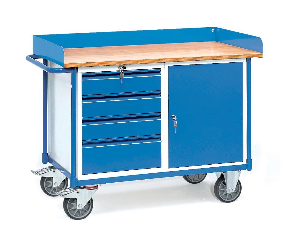 Wózek warsztatowy produkcji niemieckiej, konstrukcja stalowa, powierzchnia robocza ze sklejki gr. 22 mm, z trzech stron podwyższona krawędź o wysokości 80 mm. Wózek składa się z szafki z szufladami i dodatkowej półki. 4 specjalne koła pneumatyczne Fetra TPE, z czego 2 obrotowe z hamulcem, 2 stałe. Totalstop – centralny układ hamulcowy Fetra.