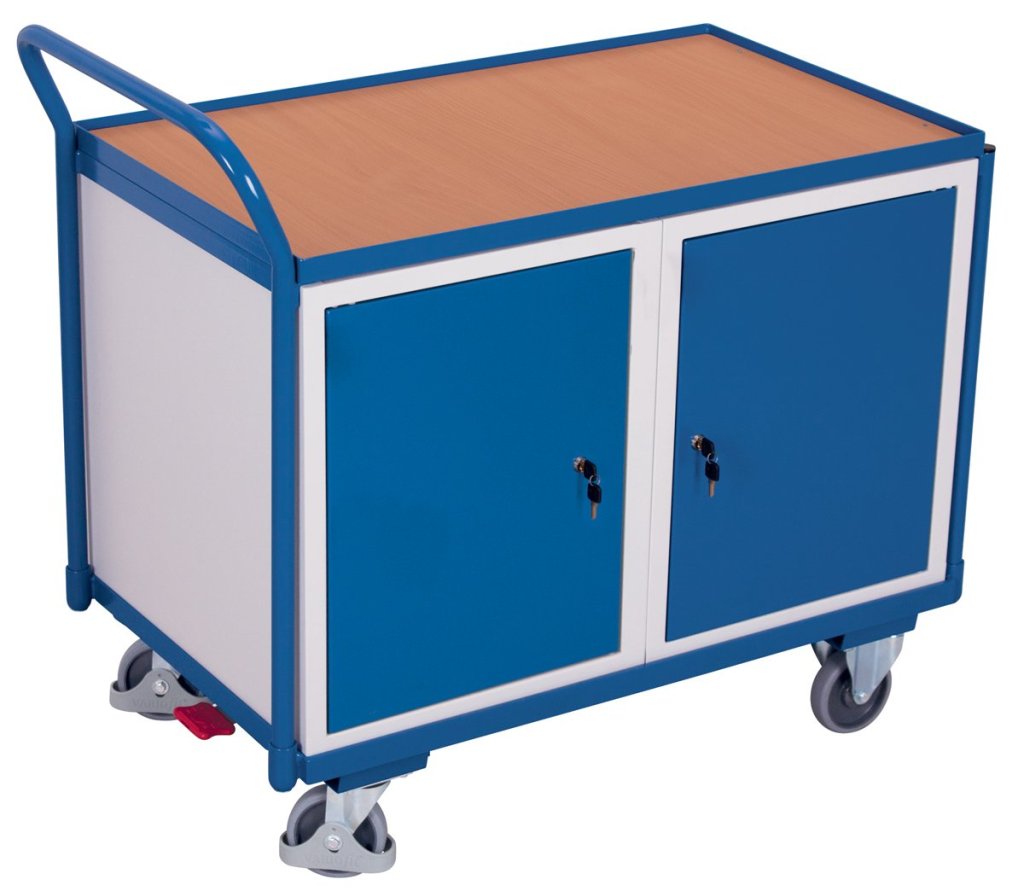 Wózek warsztatowy z dwiema szafkami i solidnymi drzwiami. Wykonane z profili stalowych. Powierzchnia robocza ze sklejki bukowej. Kolor RAL 7035 jasnoszary, uchwyt, konstrukcja, front - kolor proszkowy RAL 5010 niebieski. 2 kółka skrętne z centralnym hamulcem Easy Stop, 2 stałe. Wysokość 1010 mm, szerokość 1125 mm, głębokość 625 mm.