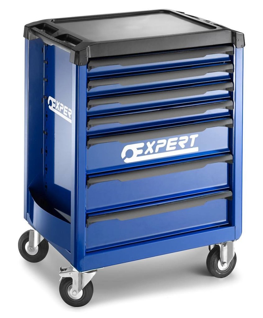 Wózek serwisowy warsztatowy z 7 szufladami. Wysokość 970 x szerokość 748 x głębokość 515 mm. Nasadka 6 x 60 mm i 1 nasadka 210 mm. 2 koła skrętne i 2 stałe, uchwyt. Kolor niebieski/antracyt.