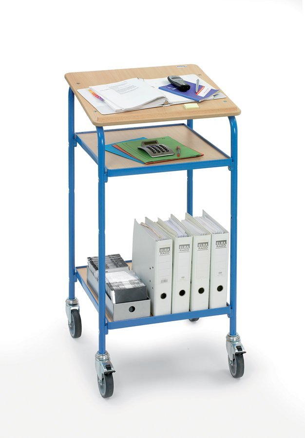 Wózek z półkami wyprodukowany w Niemczech. Wykonany ze spawanych rur stalowych, konstrukcja skręcana. Obróbka powierzchni w kolorze niebieskim RAL 5007. Płyty z materiału drewnopochodnego. 2 regulowane półki - szerokość 605 mm, głębokość 589 mm. Wymiary całkowite (wys. x szer. x gł.) w mm 1195 x 615 x 610. Całkowita nośność 100 kg. 4 obrotowe specjalne koła pneumatyczne Fetra TPE.