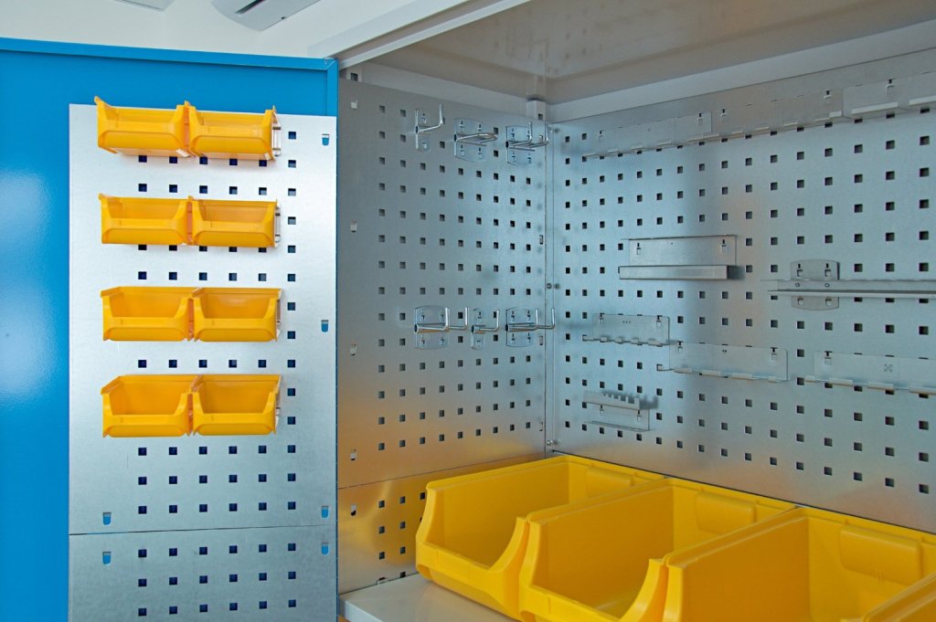 Ekonomiczna dwudrzwiowa szafa warsztatowa z panelami perforowanymi. Wysokość 1950 x szerokość 950 x głębokość 500 mm. Zamek trzypunktowy rozstawu osi, 3 półki regulowane, 3 szuflady (wysuw 90%). Kolor korpusu RAL 7035 jasnoszary, drzwi RAL 7035 jasnoszary, RAL 5005 niebieski i RAL 5012 niebieski. Na stanie jasnoszary korpus, niebieskie drzwi RAL 5012.