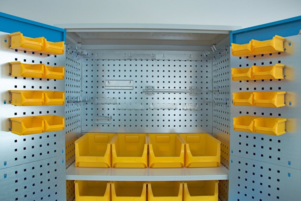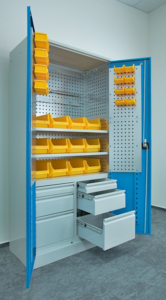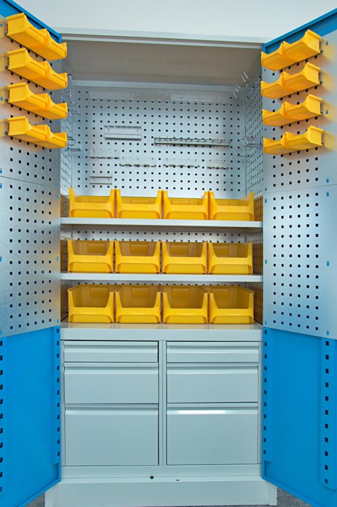 Ekonomiczna dwudrzwiowa szafa warsztatowa z panelami perforowanymi. Wysokość 1950 x szerokość 950 x głębokość 500 mm. Zamek trzypunktowy rozstawu osi, 3 półki regulowane, 10 szuflad (wysuw 90%). Kolor korpusu RAL 7035 jasnoszary, drzwi RAL 7035 jasnoszary, RAL 5005 niebieski i RAL 5012 niebieski.