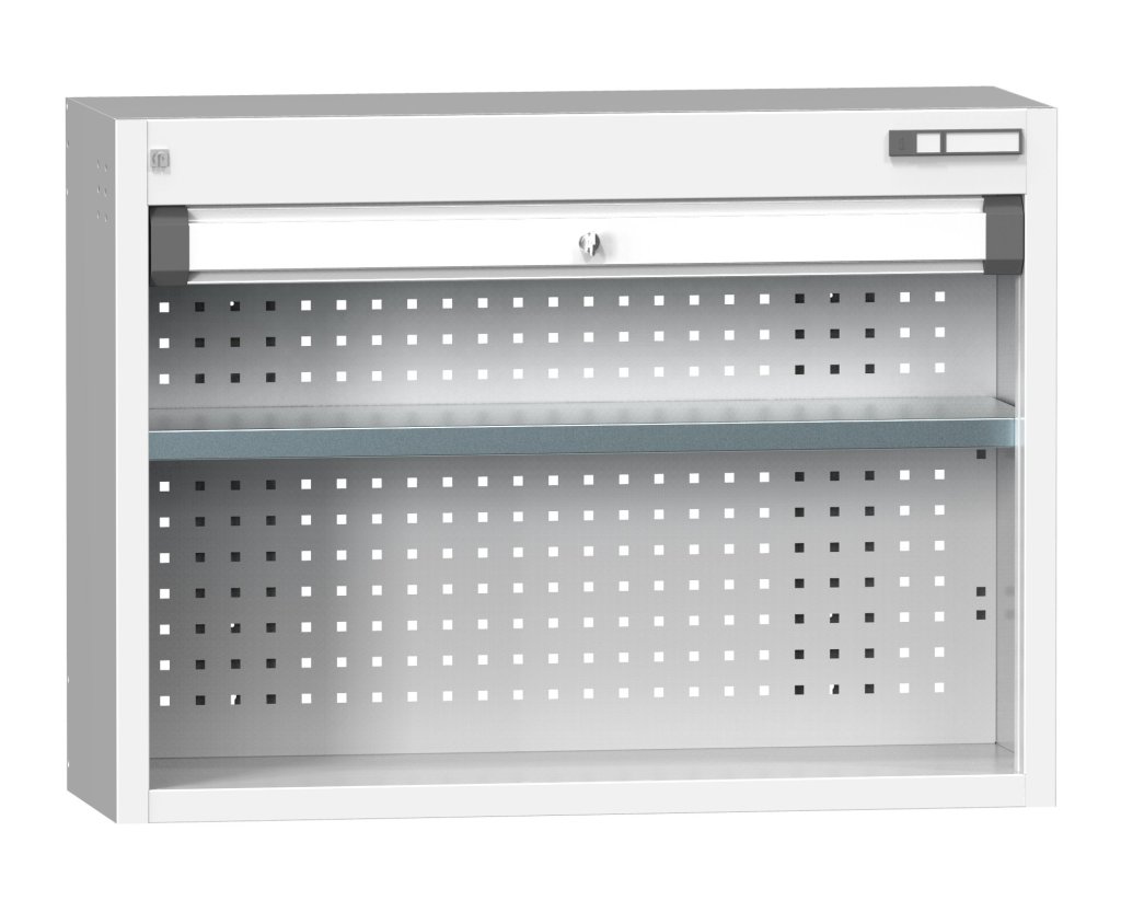 Przedłużenie szafki stołu roboczego, drzwi skrzydłowe z zamkiem bębenkowym. Szerokość 1000 mm, wysokość 736 mm, głębokość 350 mm, 1x półka. Nadaje się również do zawieszenia na ścianie. Aby umieścić oświetlenie (SLIMp30) pod szafką należy dodatkowo zamówić mocowanie magnetyczne.
