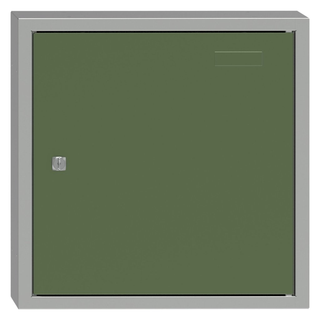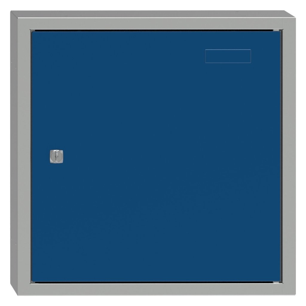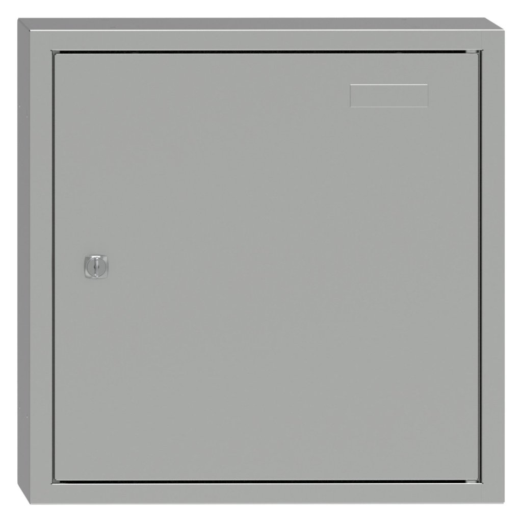 Jednodrzwiowa zamykana skrytka, wysokość 450, szerokość 450, głębokość 426 mm. Kolor korpusu RAL 7035 jasnoszary.