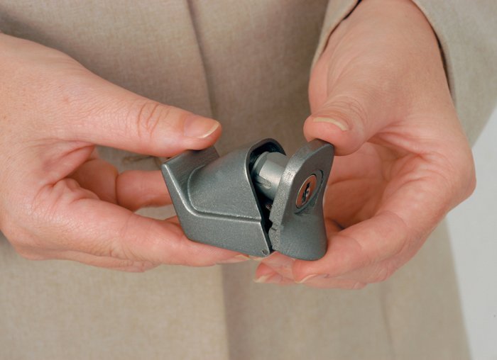 Wyjmowany przenośny zamek do szafek MySpace. Służy pracownikom, którzy mają różne stanowiska pracy w tym samym budynku lub nawet w bardziej odległych miejscach. Po prostu wybierają pustą szafkę i zamykają ją swoim osobistym zamkiem dokującym z kluczem bębenkowym.