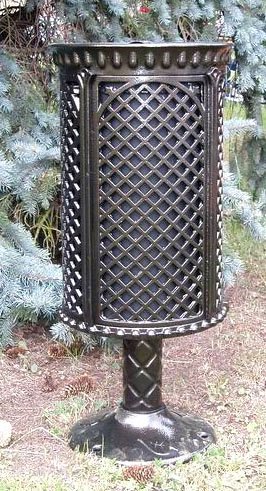 Żeliwny kosz na śmieci z mocnym słupkiem. Nadaje się do miast i innych przestrzeni zewnętrznych. Wykonany z litego żeliwa ze stalową siecią. Pojemnik na odpady wykonany jest z blachy stalowej ocynkowanej. Grubość blachy 1,5 mm. Wysokość kosza 1100 mm, średnica 300 mm, waga 45 kg. Gwarancja 2 lata.