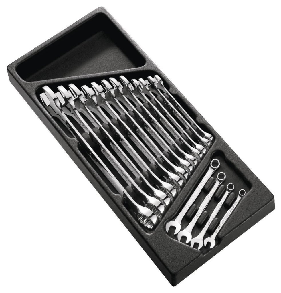 16-częściowy zestaw kluczy płasko-oczkowych 6 - 24 mm, przechowywanych w plastikowym module. Rozmiar 185 x 420 mm.