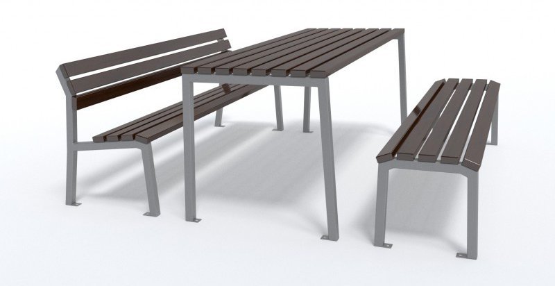 Stół z dwiema ławami. Konstrukcja stalowa jest malowana na wybrany przez Ciebie palony kolor, drewniane deski wykonane są z litego drewna - obróbka powierzchniowa listew odbywa się za pomocą 3x lakieru szkliwionego z filtrem UV. Zestaw można zakotwić do podłoża za pomocą wkrętów lub wybrać opcję betonowania. Szerokość całego zestawu 1360 mm, wysokość powierzchni siedziska 450 mm.