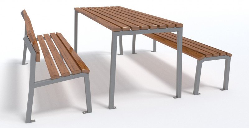 Zestaw ogrodowy z bardzo solidną konstrukcją ławek i stołu. Zestaw ogrodowy zawiera - 1x stół + 1x ławka z oparciem i 1x ławka bez oparcia. Konstrukcja z profilu zamkniętego 60 x 60 mm, zabezpieczona farbą piecową lub ocynkowana ogniowo. Możliwość mocowania do podłoża śrubami lub zabetonowania. Wymiary listew 1500 x 120 x 40 mm. Gwarancja 2 lata.