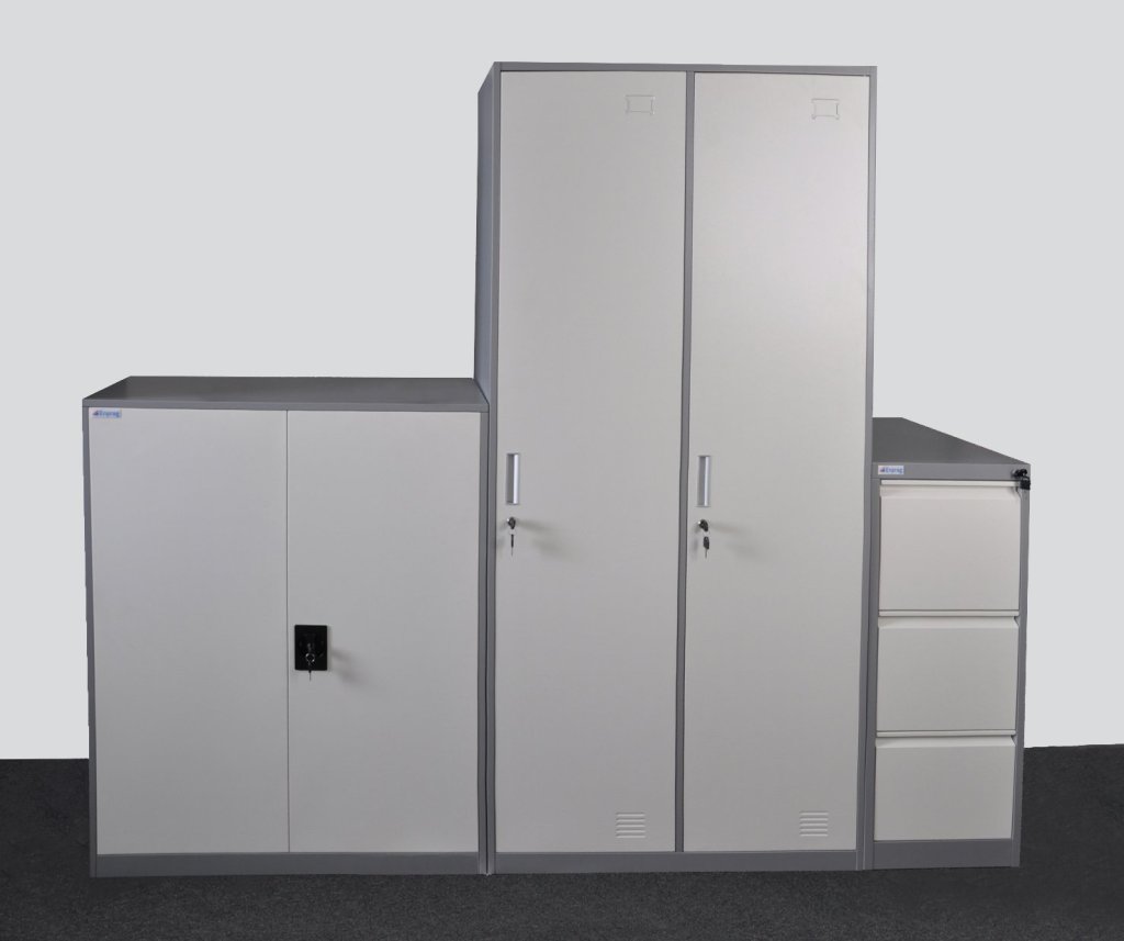 Zestaw szaf biurowych składający się z szafki kartotekowej, szafy na ubrania oraz szafki roletowej. Całość wykonana z wysokiej jakości i mocnej blachy stalowej o grubości 0,6 mm. Obróbka powierzchni farbą proszkową - korpus ciemnoszary, roleta jasnoszara, drzwi białe. Demontaż, łatwy i szybki montaż zgodnie z załączoną instrukcją.