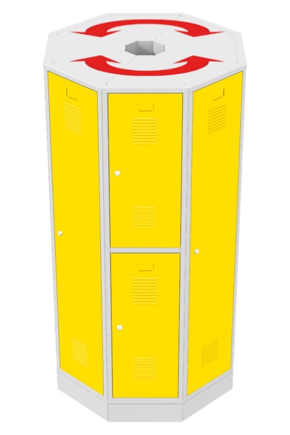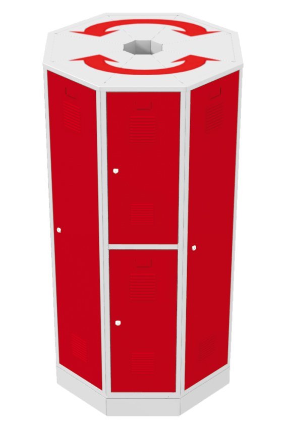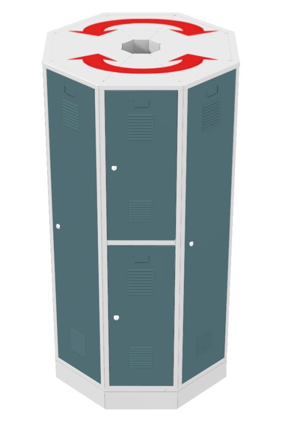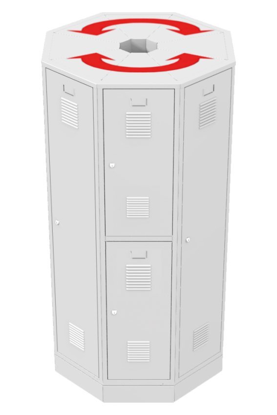 Wolnostojąca kolumna obrotowa z 8 szafami przeznaczonymi do montażu w przestrzeni lub w rogu. Zawiera 4 sztuki szaf jednodrzwiowych RAS X1A i 4 sztuki szaf dwudrzwiowych dzielonych RHS X1A. Całkowita wysokość 1870 x szerokość 1000 x głębokość 1000 mm. Kolor korpusu RAL 7035 jasnoszary.