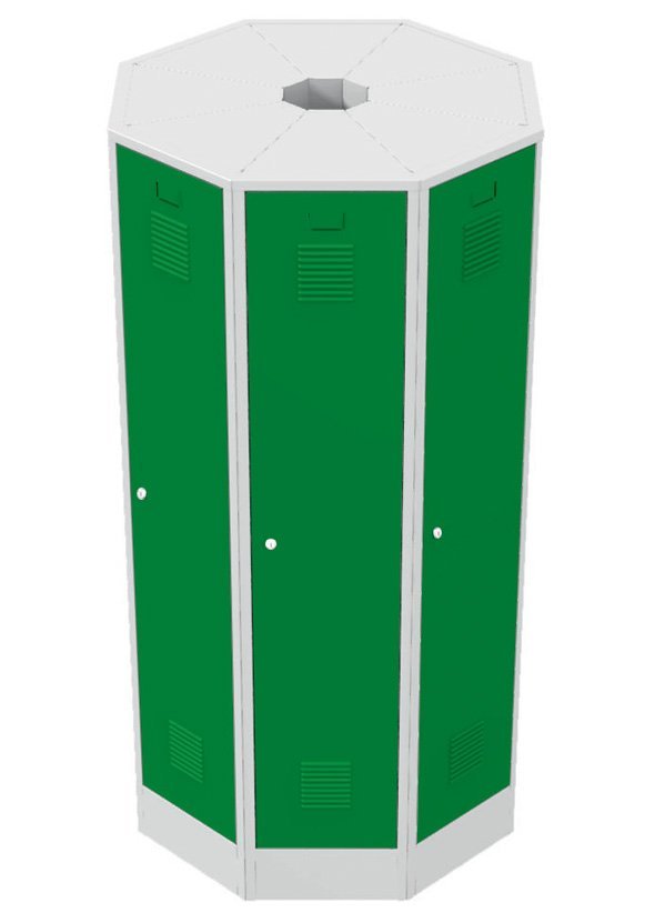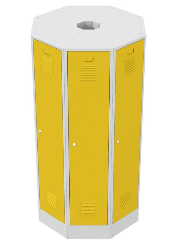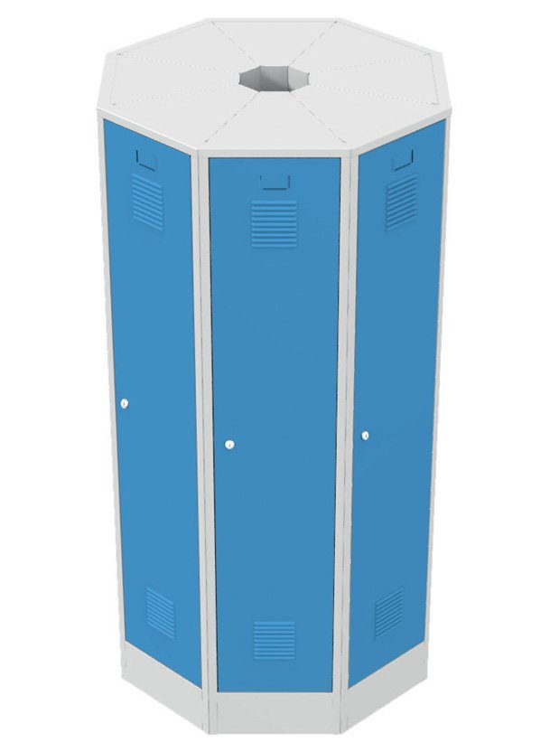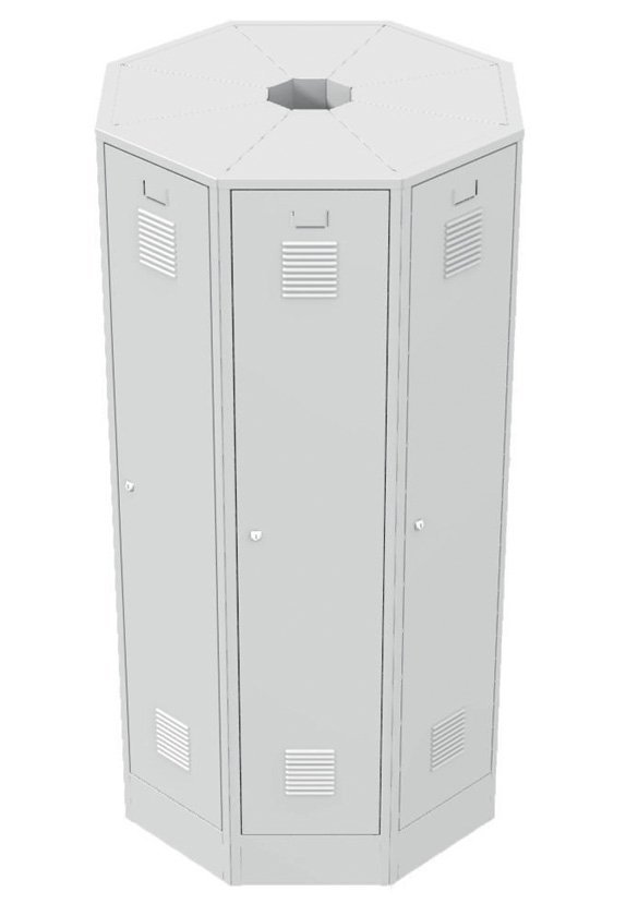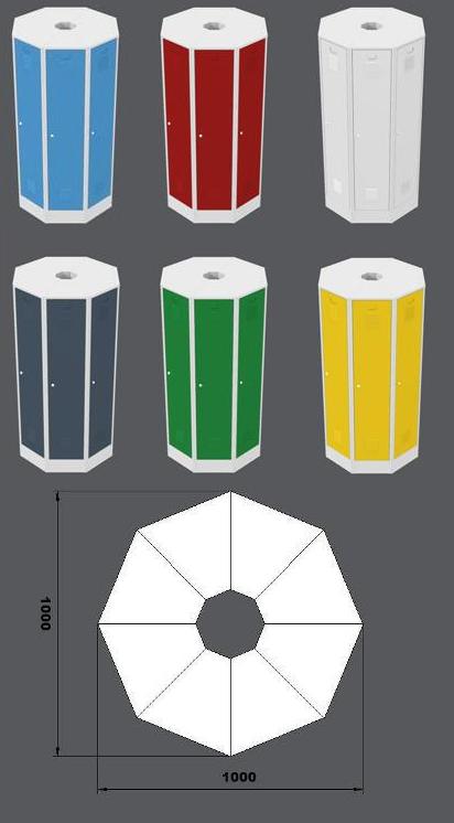 Zestaw 8 trójkątnych szaf RAS przeznaczonych do montażu w wolnostojący okrągły blok. Zaletą jest duża ilość schowków garderobianych (8 szt.) w wolnostojącym monolicie, który przeznaczony jest do montażu w przestrzeni. Wysokość 1850 x szerokość 1000 x głębokość 1000 mm. Kolor korpusu RAL 7035 jasnoszary.
