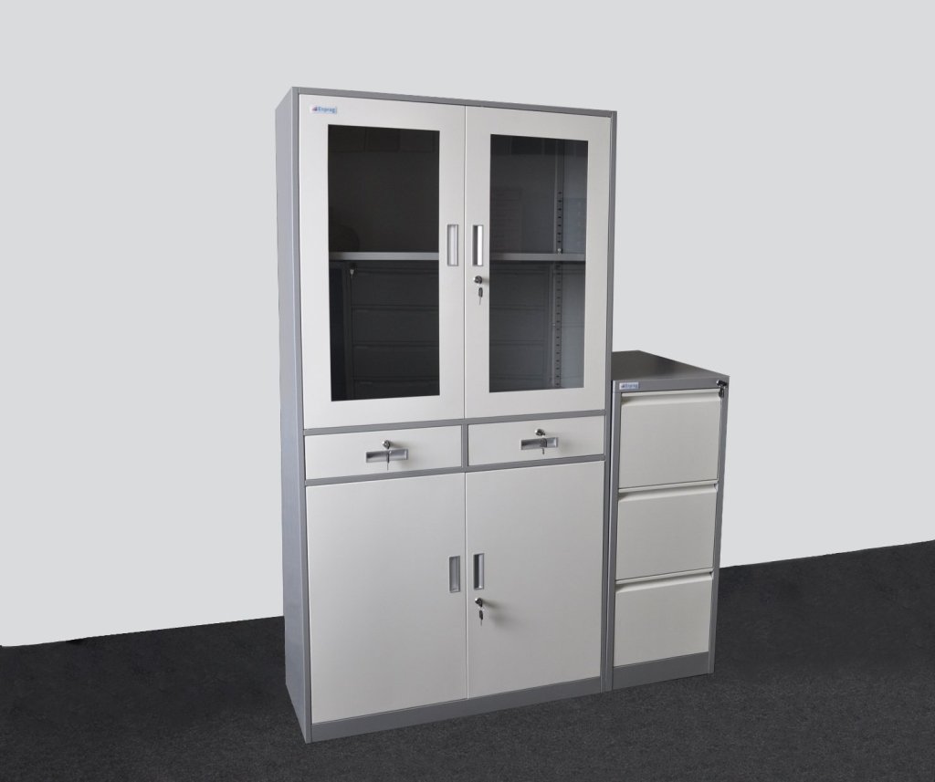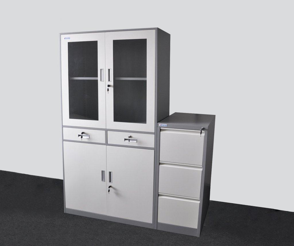 Zestaw szaf biurowych składający się z szafy na dokumenty formatu A4, szafy oraz szafki ze szklanymi drzwiami. Całość wykonana z wysokiej jakości i mocnej blachy stalowej o grubości 0,6 mm. Obróbka powierzchni farbą proszkową - korpus ciemnoszary, drzwi i szuflady białe. Demontaż, łatwy i szybki montaż zgodnie z załączoną instrukcją.