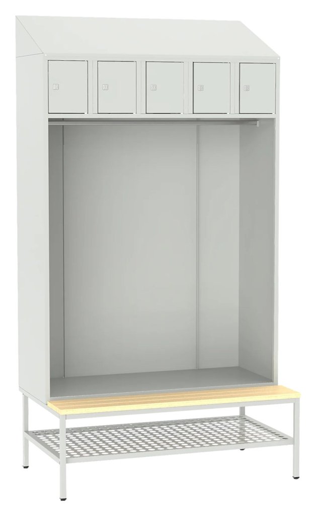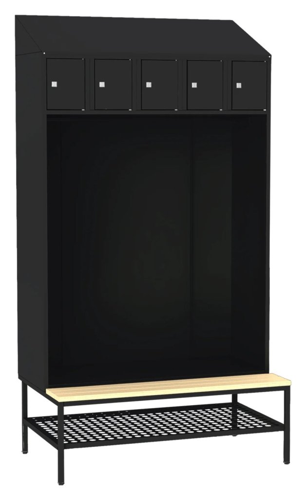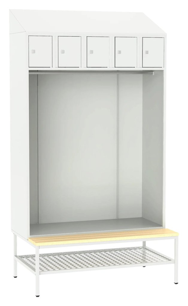 Zestaw szatniowy - szafa otwarta to praktyczne rozwiązanie do pomieszczeń wspólnych lub garderob, gdzie nie ma konieczności przechowywania ubrań w osobnych szafkach. 5x skrytka do przechowywania drobnych przedmiotów osobistych, drążek na wieszaki, ławka drewniana, perforowany stojak na buty. Do wyboru 16 odcieni kolorystycznych wliczonych w cenę bez dopłaty.