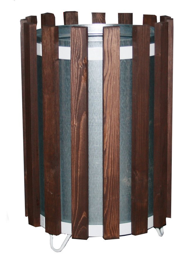 Wytrzymała obudowa z blachy stalowej z drewnianą okładziną. Bez daszku, z wyjmowanym, ocynkowanym pojemnikiem wewnętrznym. Konstrukcja malowana proszkowo lub ocynkowana. Panele drewniane pokryte 3-krotną glazurą. Wysokość 800 mm, szerokość 420 mm, głębokość 420 mm. Pojemność 65 l, waga 35 kg.